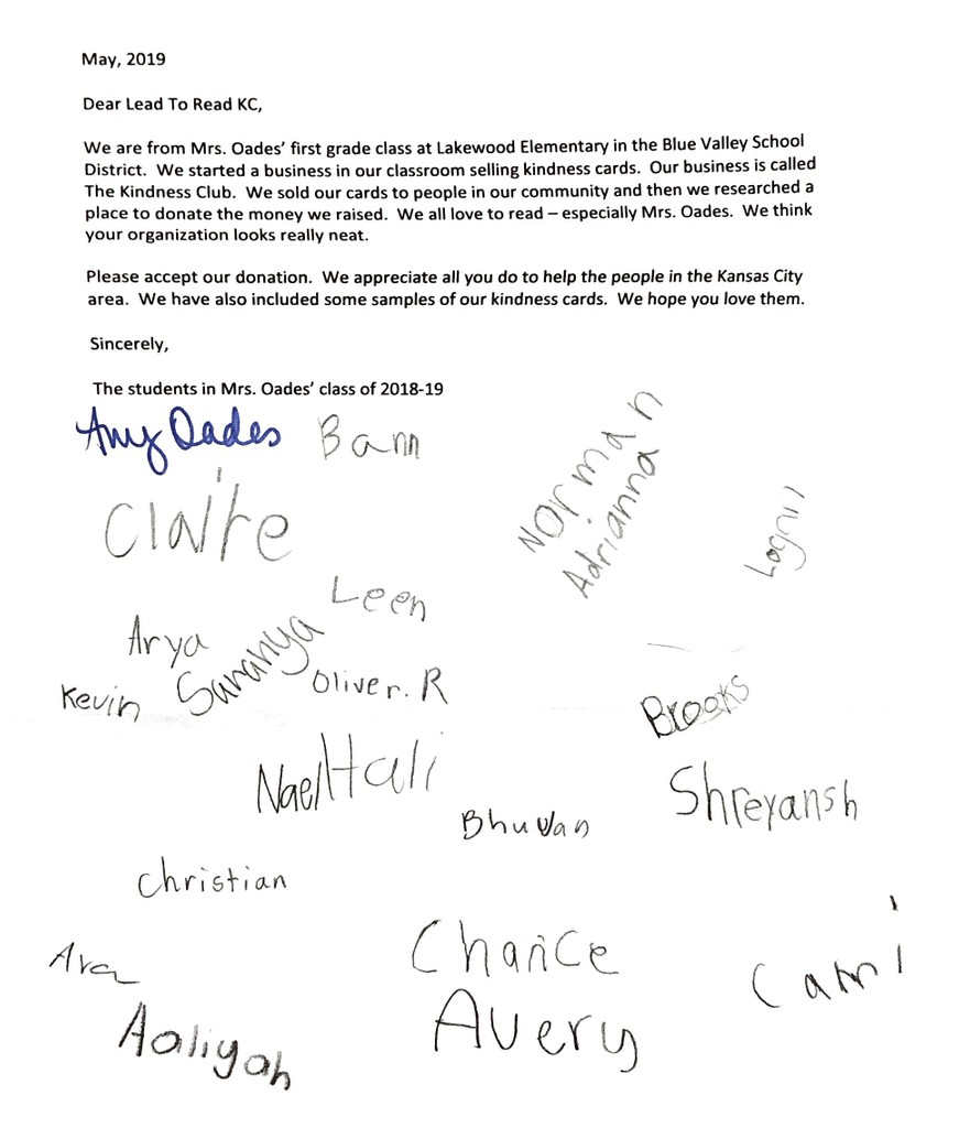 Our hearts are full! On behalf of all the students Lead to Read KC serves, we would like to recognize Mrs. Oades and her students for giving back to the community. We’re thrilled they chose Lead to Read KC as the recipient of their donation, and we’re excited to be able to share the Kindness Cards with our students. Many thanks!