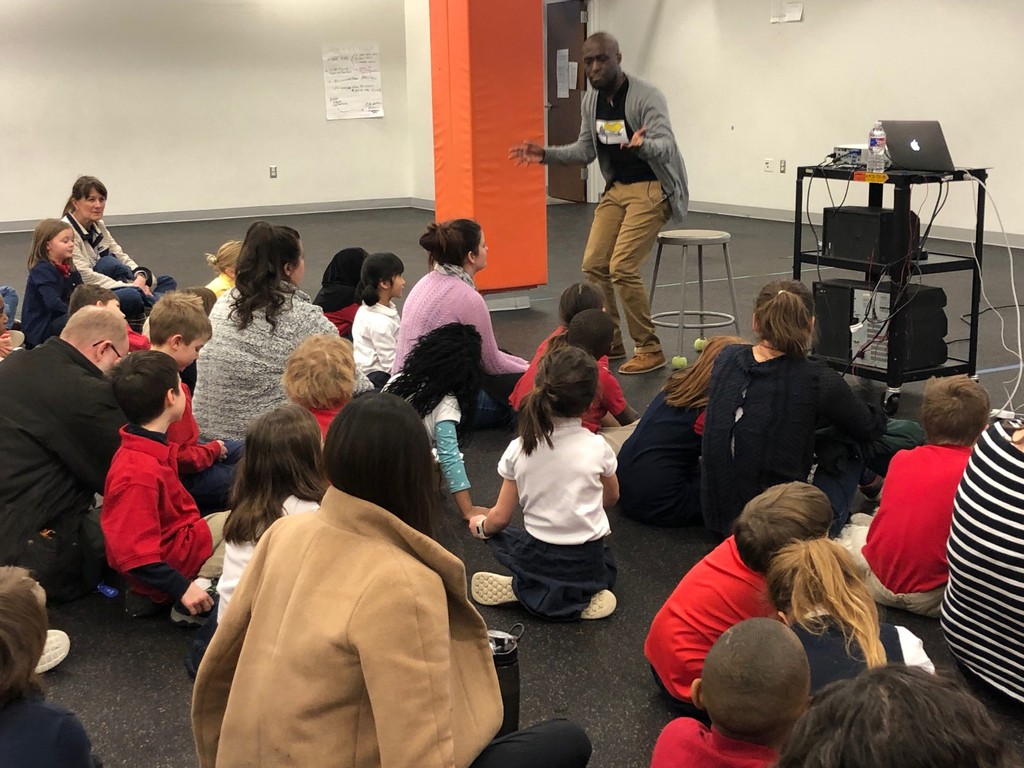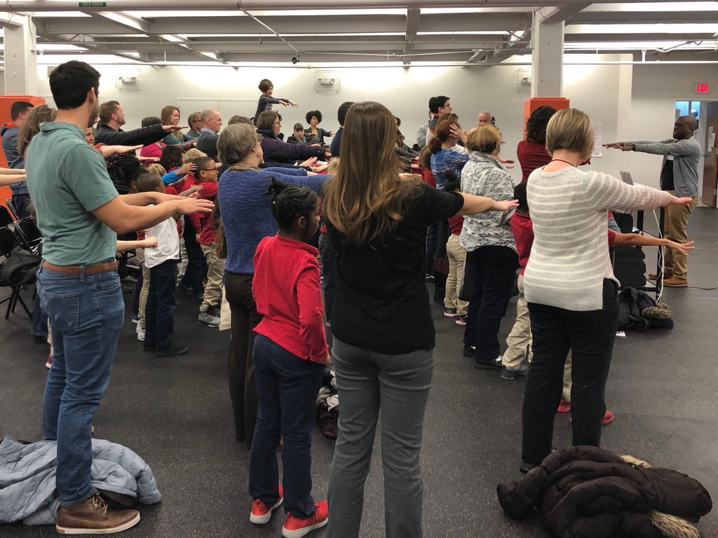 Author Vladimir Sainte demonstrates a stress management technique to students, teachers and Reading Mentors at Crossroads Academy Central Street.