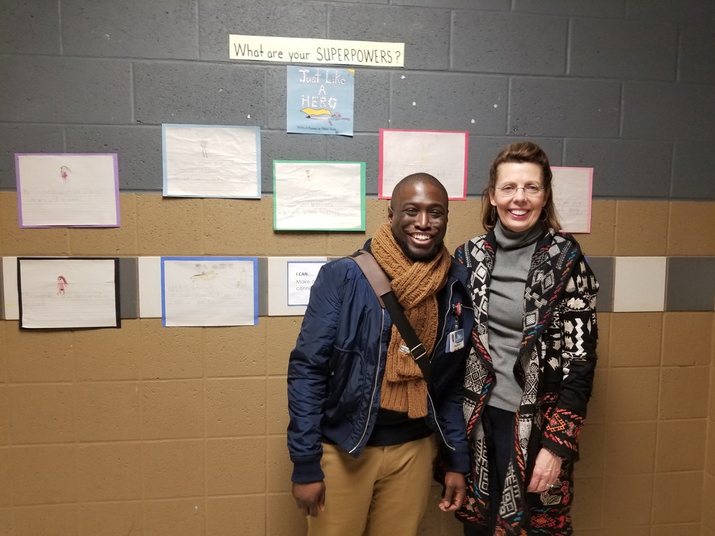 Vladimir Sainte and Lead to Read KC Site Coordinator Becky Conaghan take a look at the superhero writing projects created by students at M.L. King Elementary.
