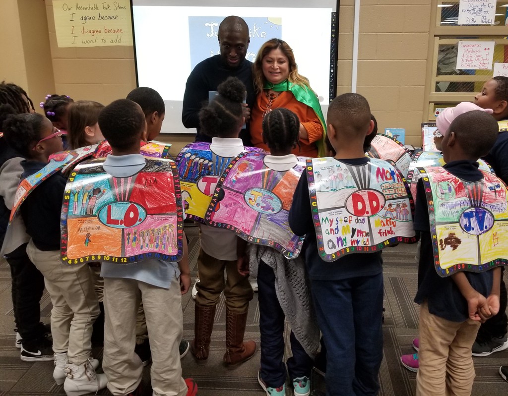 Author Vladimir Sainte and second grade teacher Nancy Ramirez, along with students at M.L. King Elementary. Check out the superhero capes!