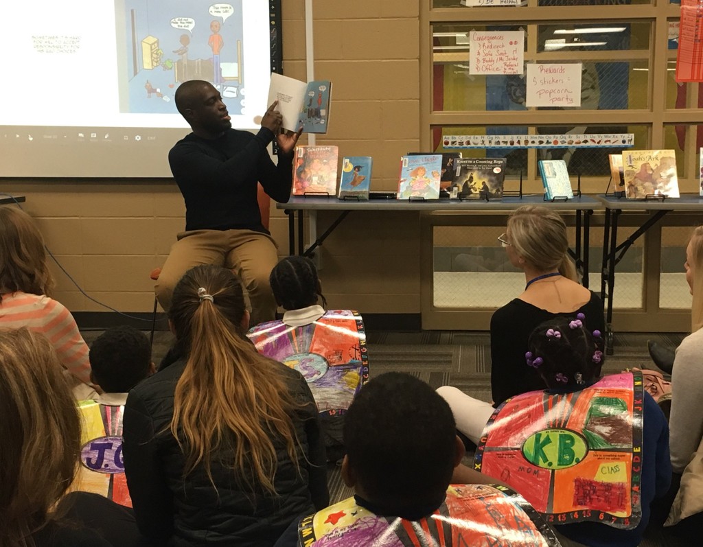 Author Vladimir Sainte shares Just Like a Hero with students and Lead to Read KC Reading Mentors at M.L. King Elementary. The book teaches personal values, challenges negative thoughts, and provides activities to promote self-esteem and coping skills.